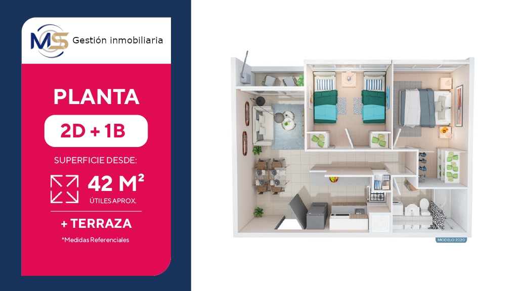 Moderno departamento de 42 m², perfectamente distribuido con 2 amplios dormitorios y 1 baño. Además, cuenta con una encantadora terraza, ideal para disfrutar del aire libre y relajarse en casa. Espacios funcionales, pensados para ofrecer comodidad y bienestar, perfecto para quienes buscan un hogar práctico y acogedor. ¡Ven a conocerlo!