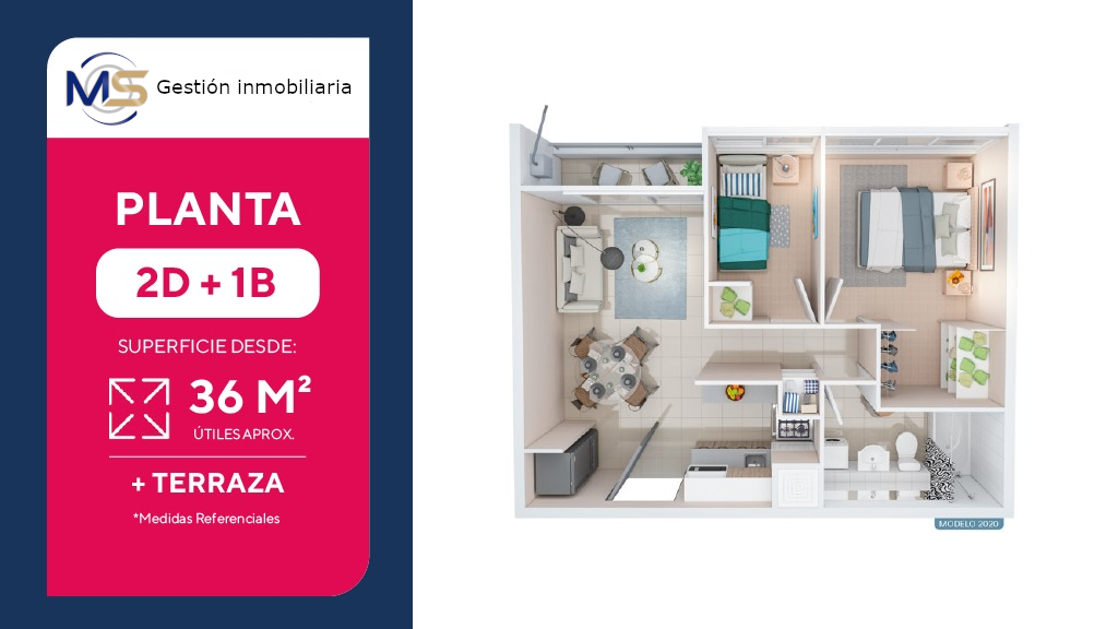 Moderno departamento de 36 m², perfectamente distribuido con 2 amplios dormitorios y 1 baño. Además, cuenta con una encantadora terraza, ideal para disfrutar del aire libre y relajarse en casa. Espacios funcionales, pensados para ofrecer comodidad y bienestar, perfecto para quienes buscan un hogar práctico y acogedor. ¡Ven a conocerlo!