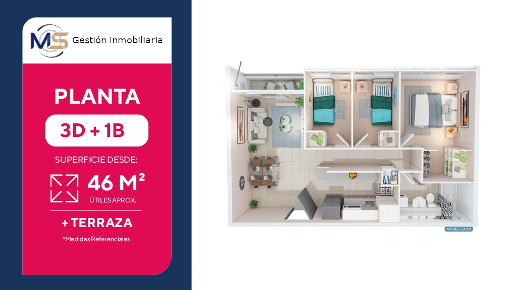Moderno departamento de 46 m², perfectamente distribuido con 2 amplios dormitorios y 1 baño. Además, cuenta con una encantadora terraza, ideal para disfrutar del aire libre y relajarse en casa. Espacios funcionales, pensados para ofrecer comodidad y bienestar, perfecto para quienes buscan un hogar práctico y acogedor. ¡Ven a conocerlo!